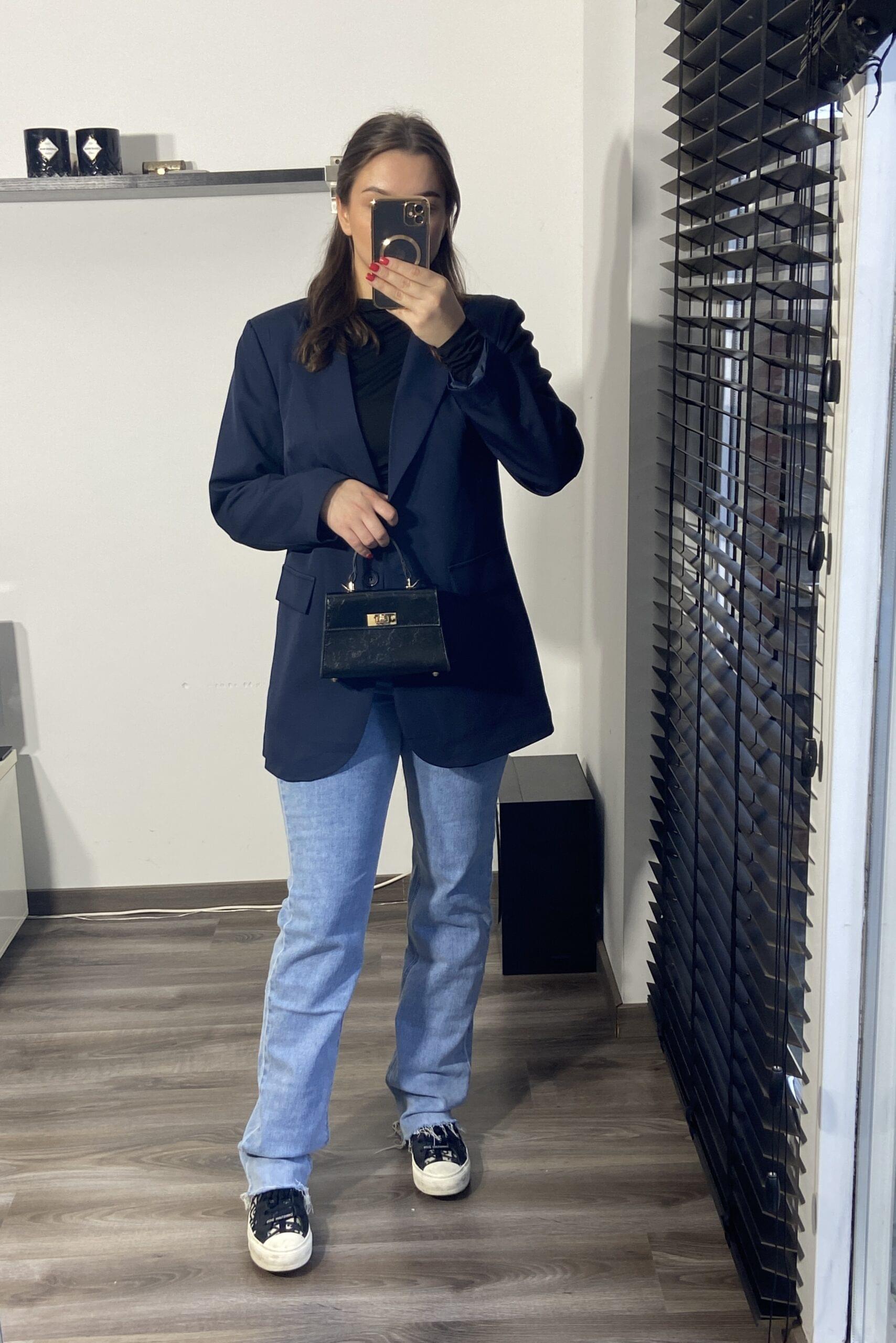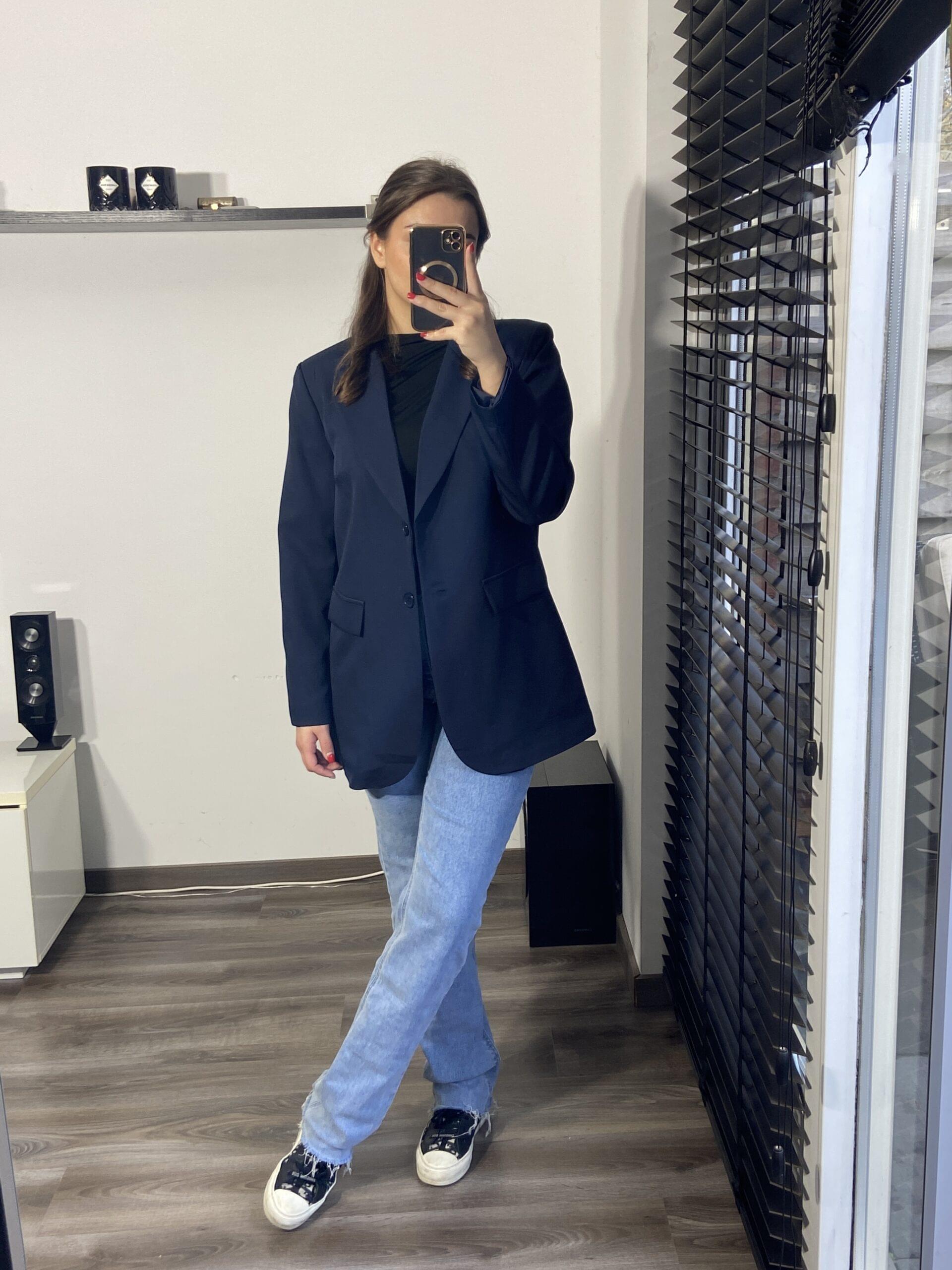 Deze super mooie blazer valt wat kleiner, hierdoor draagt ons model maat xxl. De blazer valt wel wat oversized.